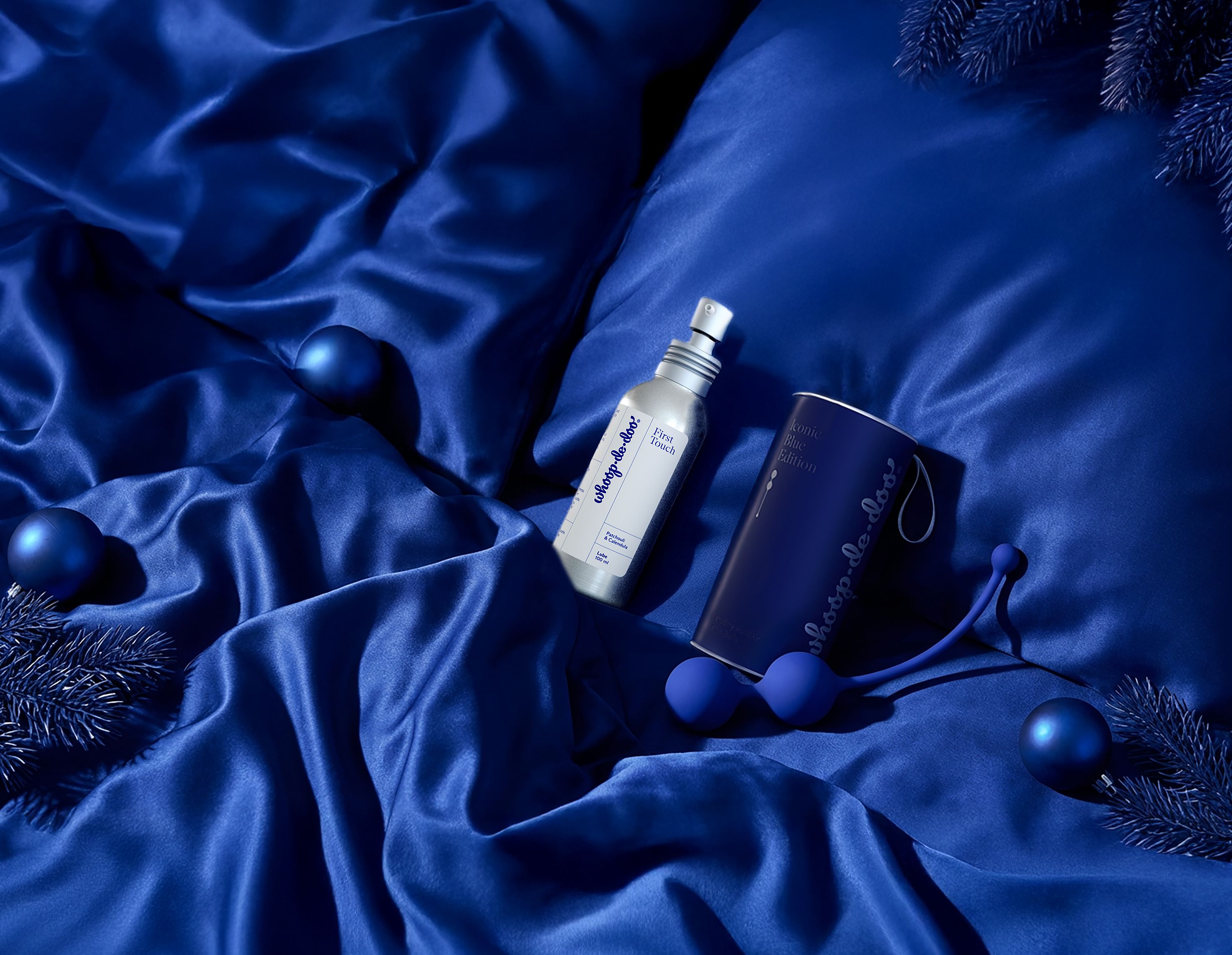 The new Whoop·de·doo balls in the Iconic Blue shade and the brand-new First Touch lubricant with a patchouli and calendula scent come together through design, sensuality and thoughtful care for the female body.